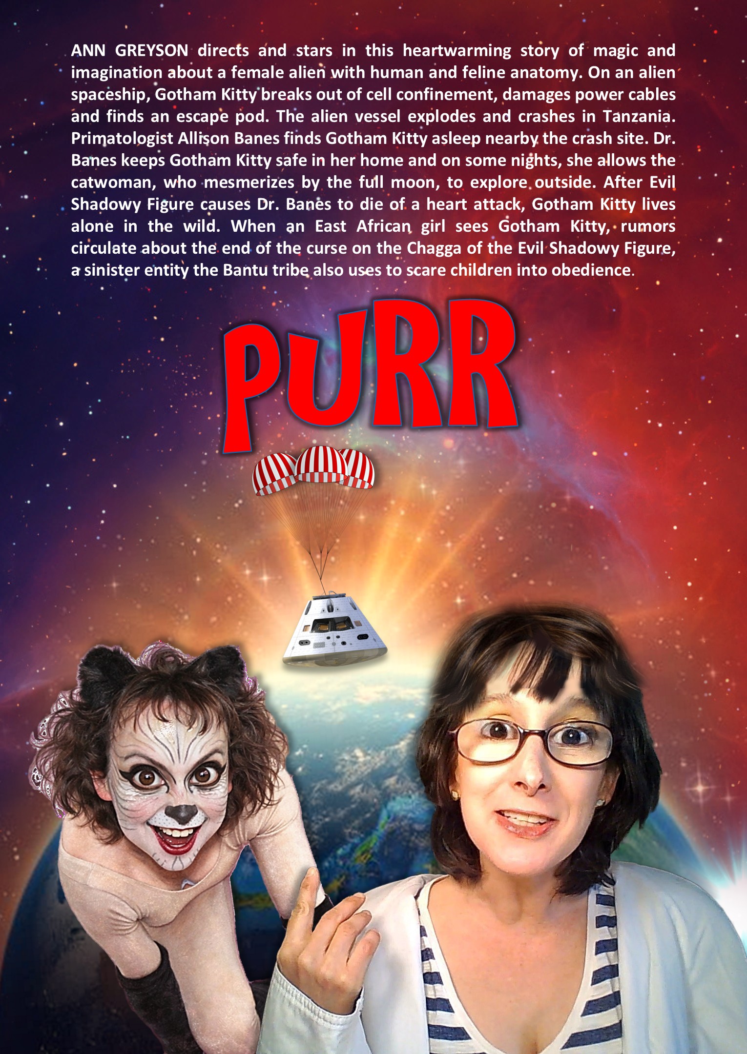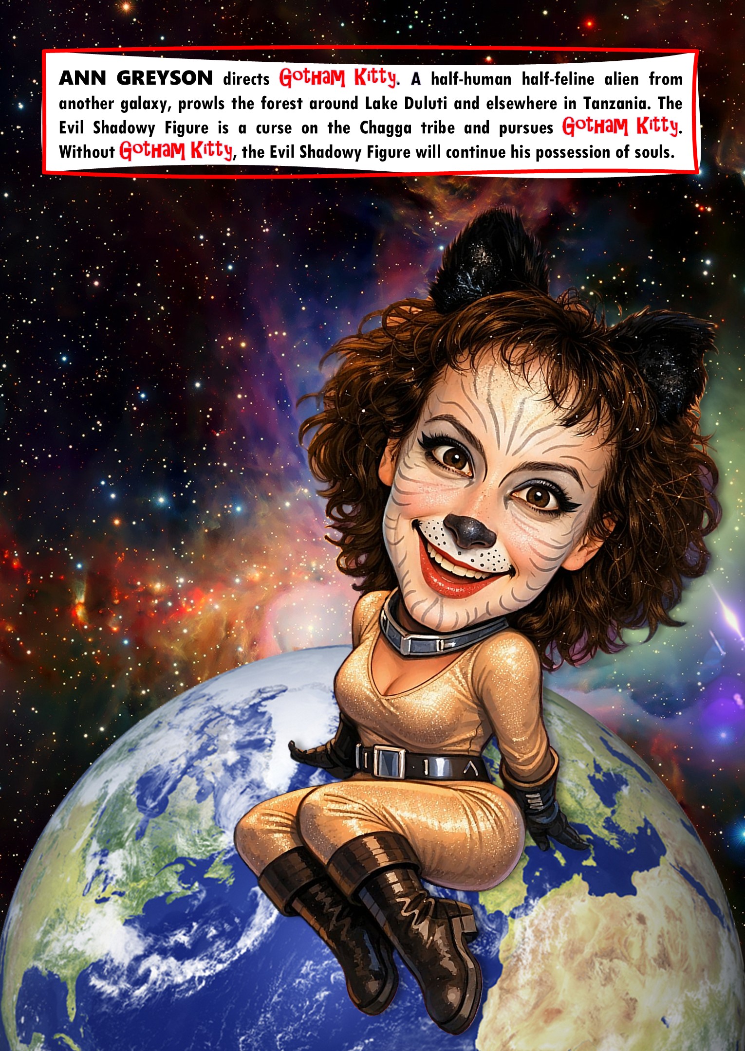 A female alien with human and feline anatomy escapes captivity in an escape pod from a Brozian insectoid cargo ship. On Earth she is discovered by Allison Banes, a PhD candidate in Tanzania. After the Evil Shadowy Figure causes Allison to die of a heart attack, the catusapien crawls to the forest around Lake Duluti. She is discovered by a young girl who will name her Gotham Kitty as they embark on a journey to end a curse on the Chagga Bantu tribe.