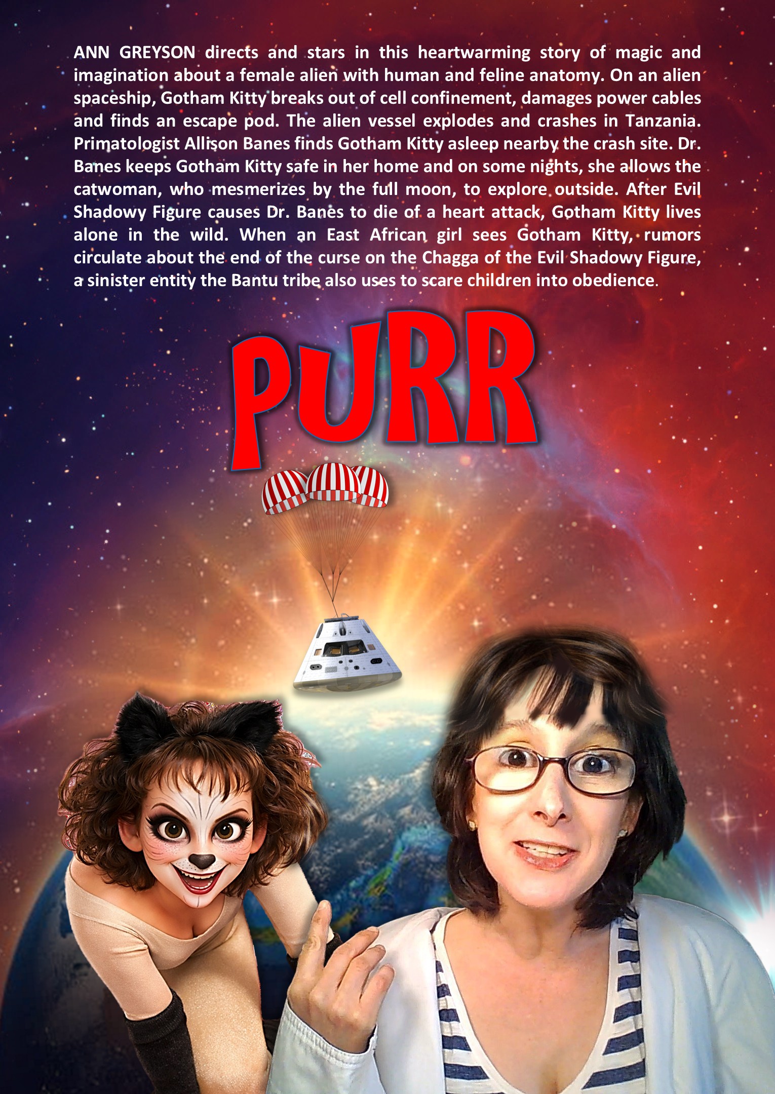 A female alien with human and feline anatomy escapes captivity in an escape pod from a Brozian insectoid cargo ship. On Earth she is discovered by Allison Banes, a PhD candidate in Tanzania. After the Evil Shadowy Figure causes Allison to die of a heart attack, the catusapien crawls to the forest around Lake Duluti. She is discovered by a young girl who will name her Gotham Kitty as they embark on a journey to end a curse on the Chagga Bantu tribe.
